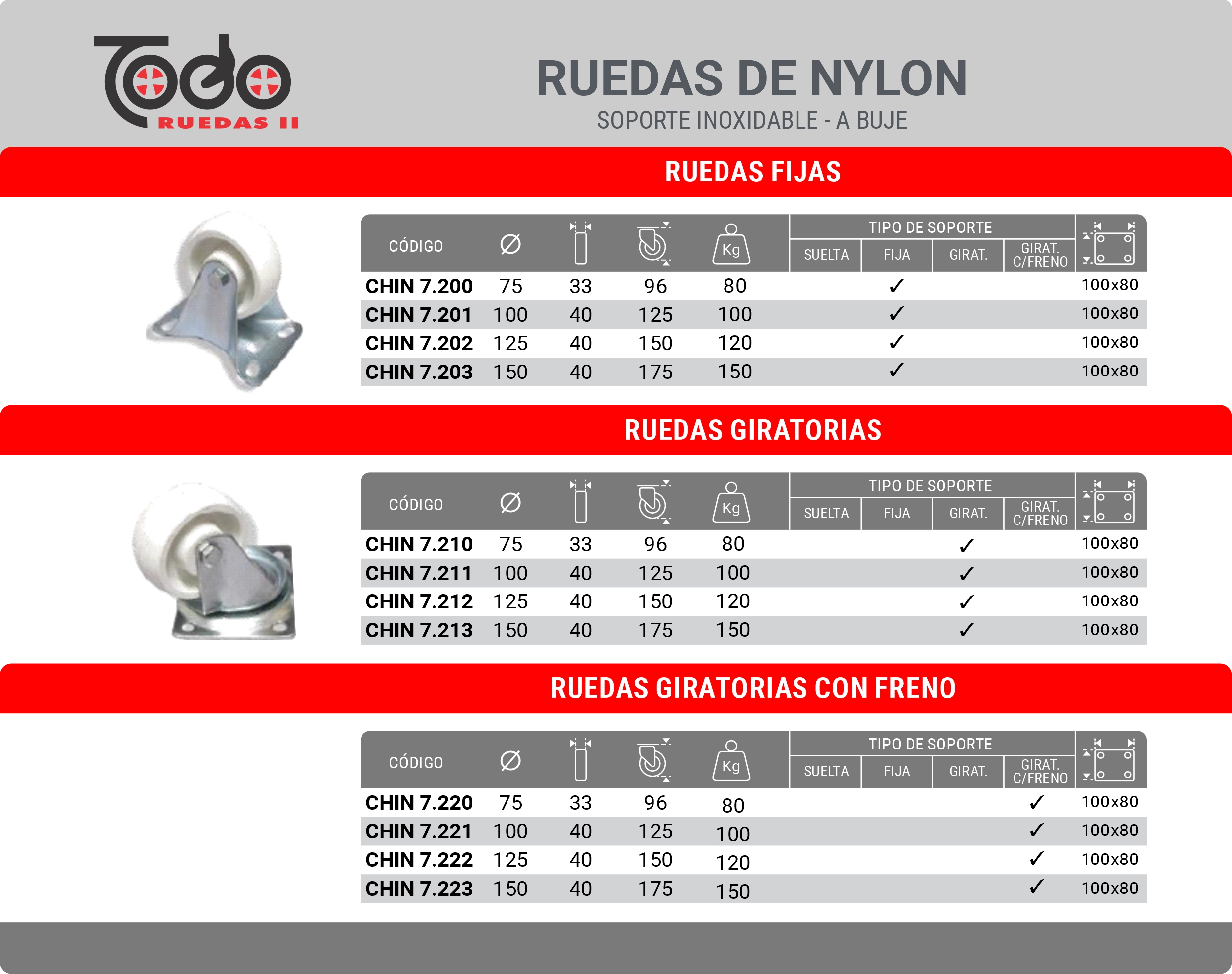 Ruedas Nylon y Poliuretano – Soporte Inoxidable Planchuela 4mm